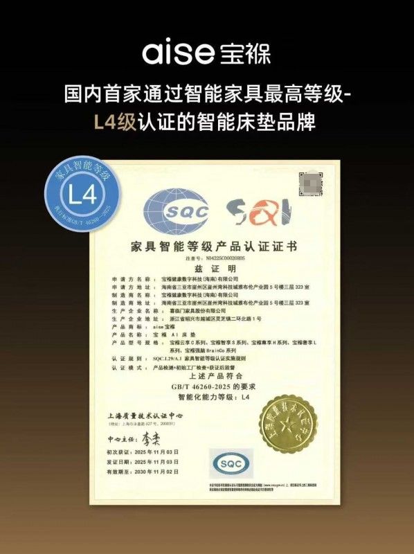 喜临门旗下aise宝褓,拿下首个L4级智能床垫品牌认证